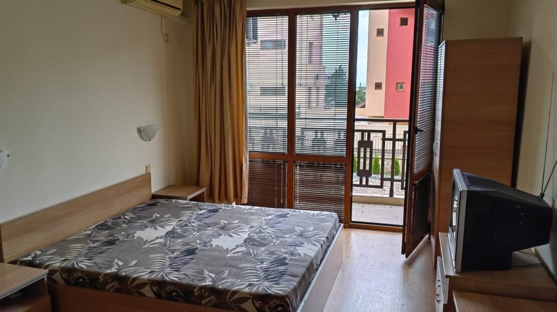 Предлагаем на продажу однокомнатную квартиру (студию) в комплексе Panorama Bay 2 — Святой Влас. Квартира расположена на 1 этаже площадью 41 кв м. Она состоит из небольшого коридора, кухонной зоны, спальной зоны, террасы с видом на бассейн и ванной комнаты с душевой кабиной и туалетом. Продажа с мебелью и бытовой техникой видно на фото. Окна выходят на южную сторону.