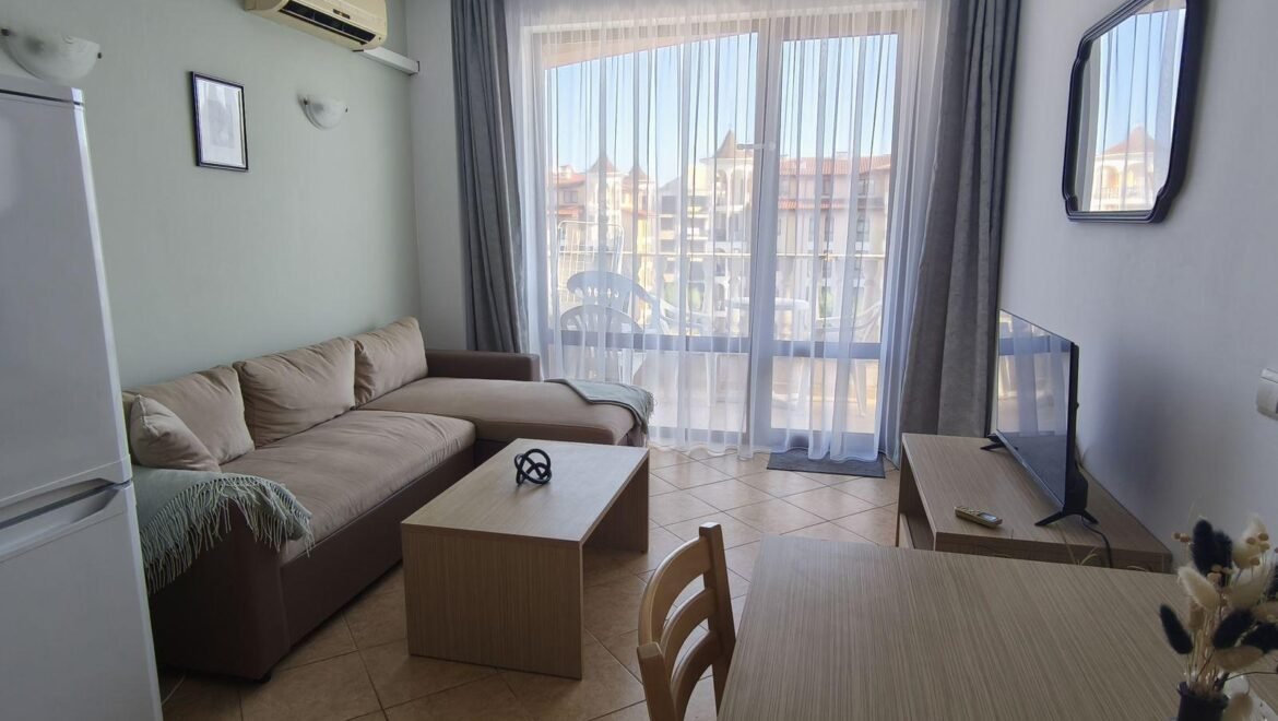 Меблированная 1-комнатная квартира на Солнечном берегу — вид на бассейн, южная сторона, отличный потенциал для сдачи в аренду